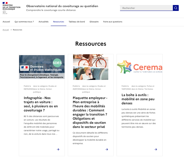 L'onglet "[**Ressources**](http://observatoire.covoiturage.gouv.fr/ressources)" de l'Observatoire national du covoiturage au quotidien propose diverses publications (publications scientifiques, études, fiches techniques) utiles pour alimenter son projet.