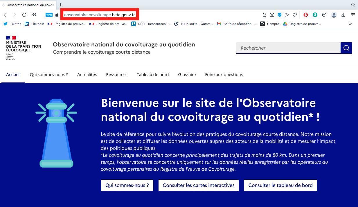 ### Étape 1 - Je me rends sur le site de l'[Observatoire national du covoiturage au quotidien](https://observatoire.covoiturage.gouv.fr)